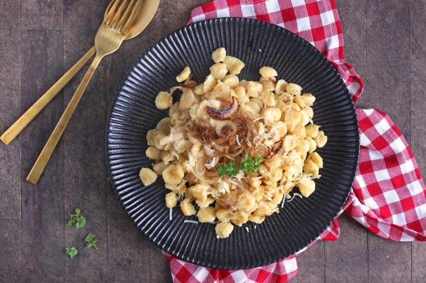 5. Rimettere la padella con le cipolle sul fuoco, spostare leggermente da parte le cipolle e versare gli spätzle nella padella. Aggiungere il formaggio e lasciarlo fondere. Aggiustare di sale, pepe e noce moscata.